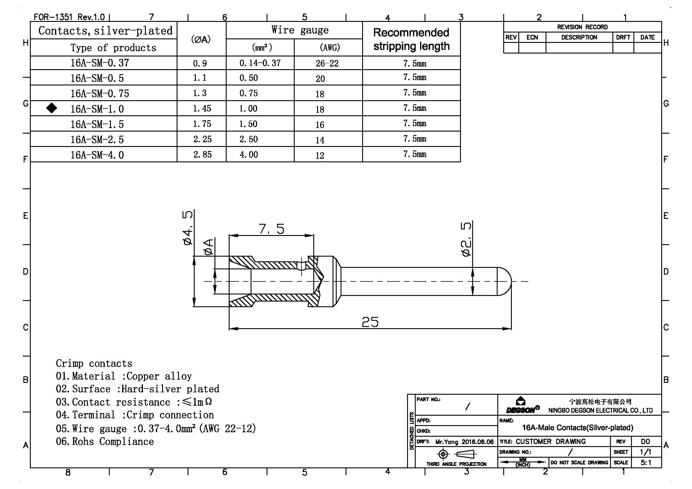 Штыревой контакт для вставки, 1.0 кв.мм, 16А, посеребр