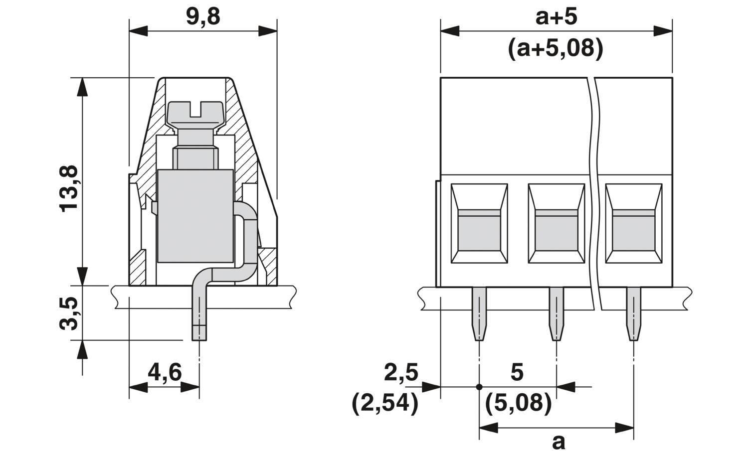 MKDS 1,5/ 2 Клемма д/печатн.монтажа, 17,5 А, 400 В, 5мм, 2Р, винт.зажим, пайка,
