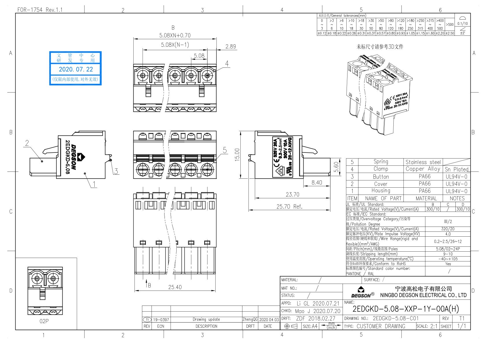 Клемма на печатную плату, 2 полюса, шаг 5.08 мм, зеленая