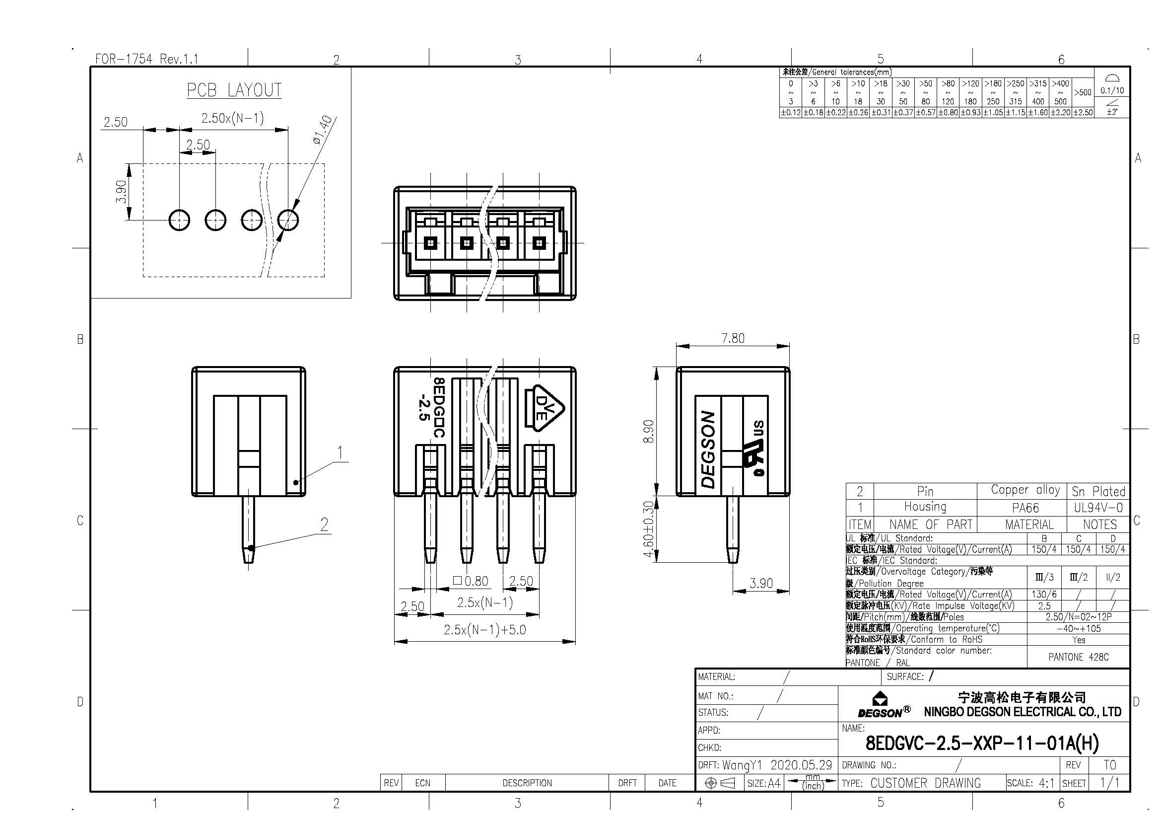 8EDGVC-2.5-08P-11-01Z(H), Клемма на печатную плату, 8...