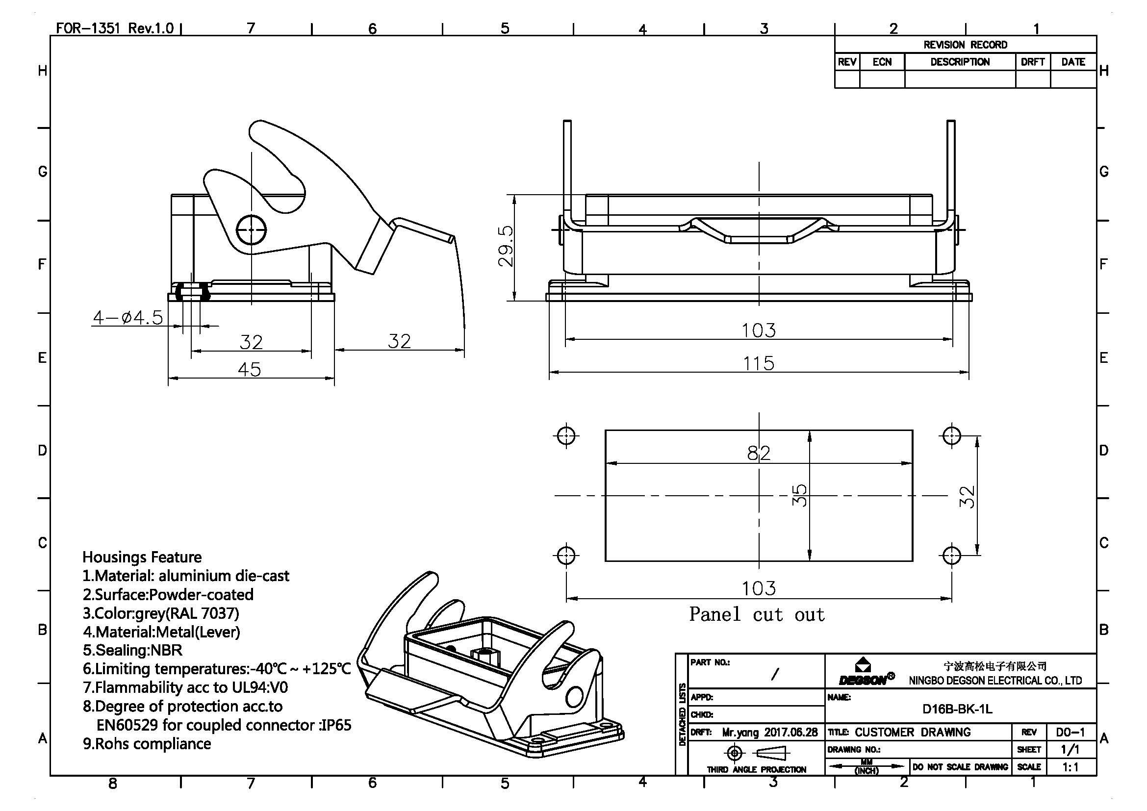 D16B-BK-1L, Корпус разъема, основание, под фланец, 1...