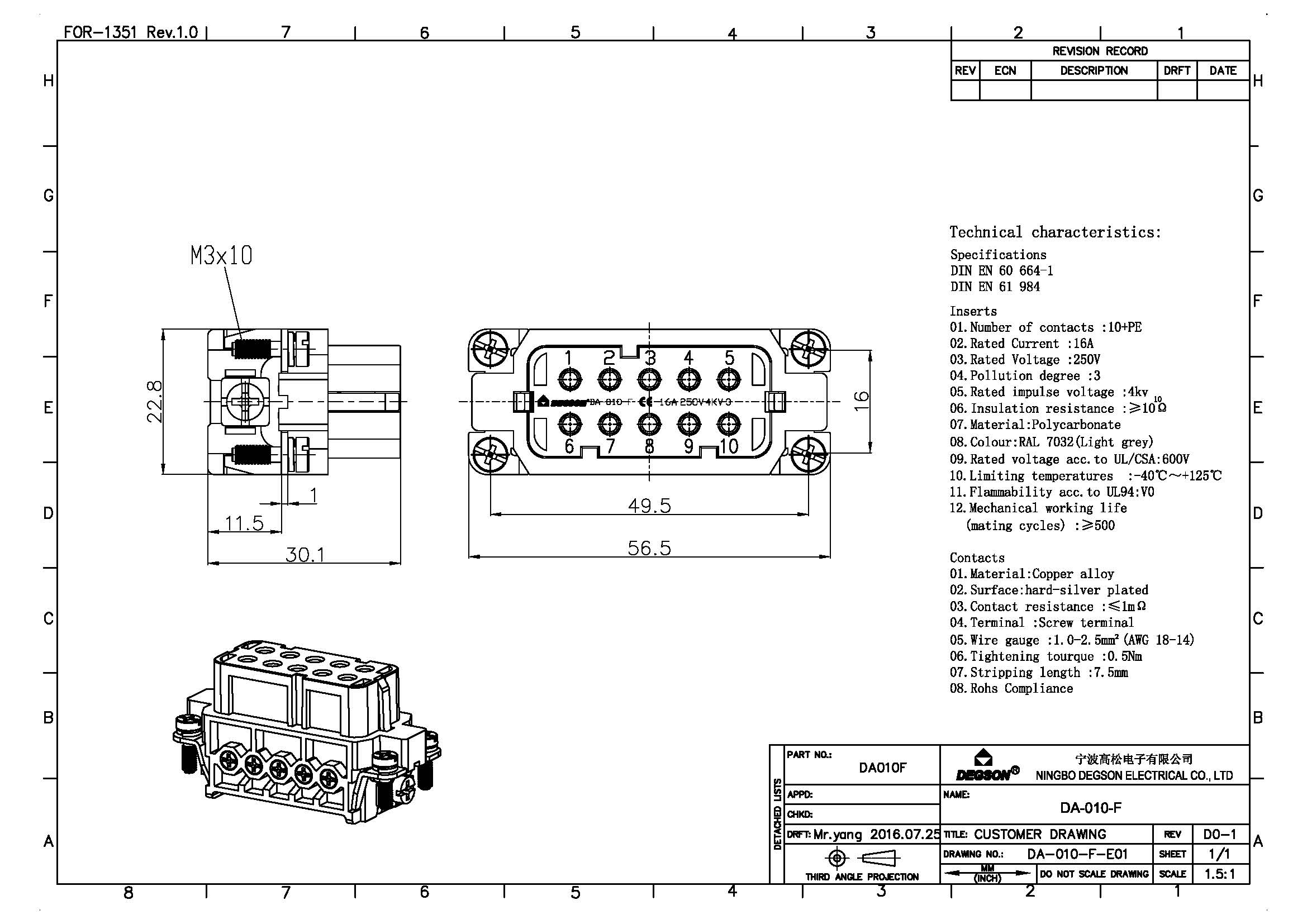 DA-010-F, Вставка в разъем, 10П+PE, 250В, 16А, вилка,...
