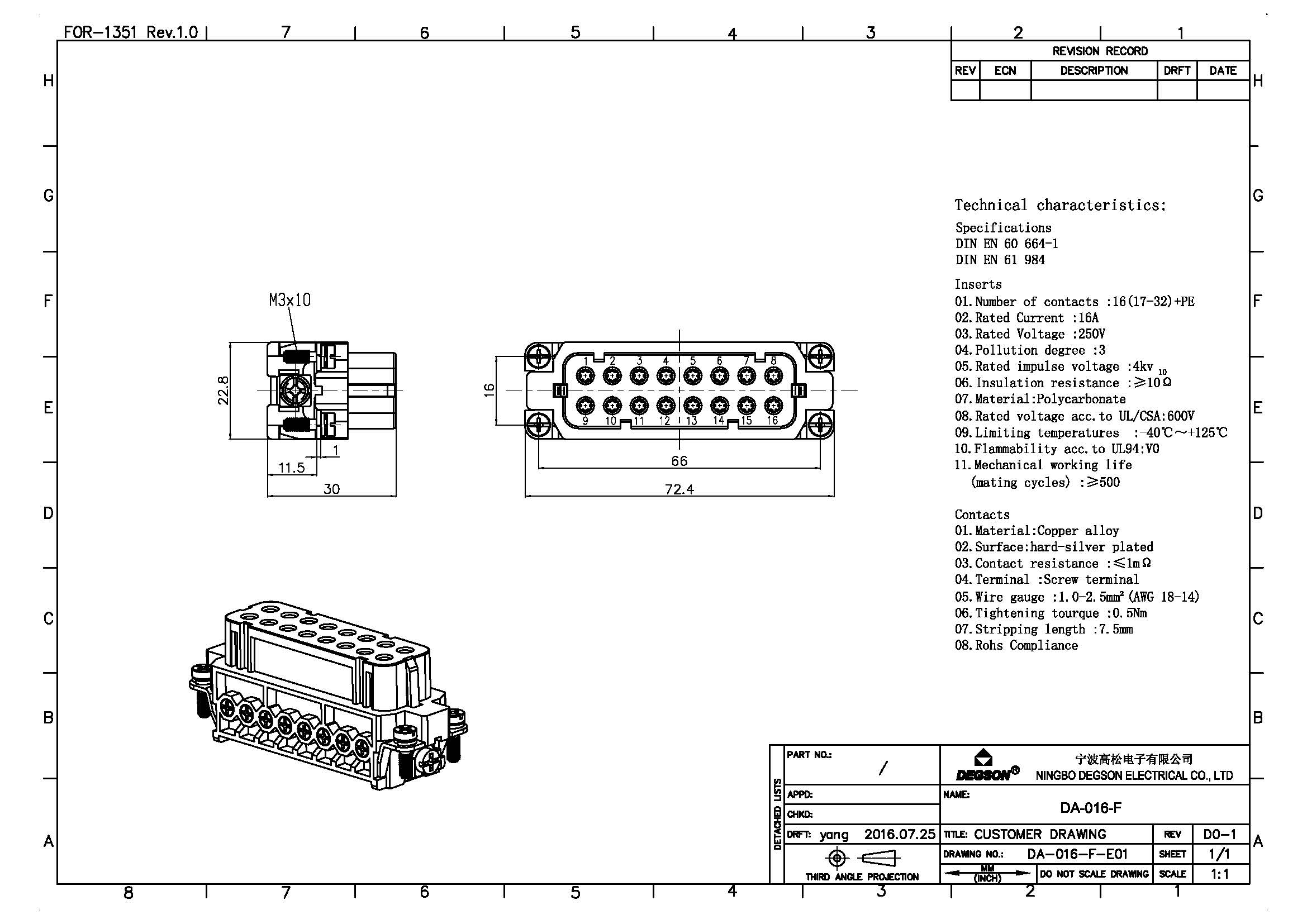 DA-016-F, Вставка в разъем, 16П+PE, 250В, 16А, вилка,...