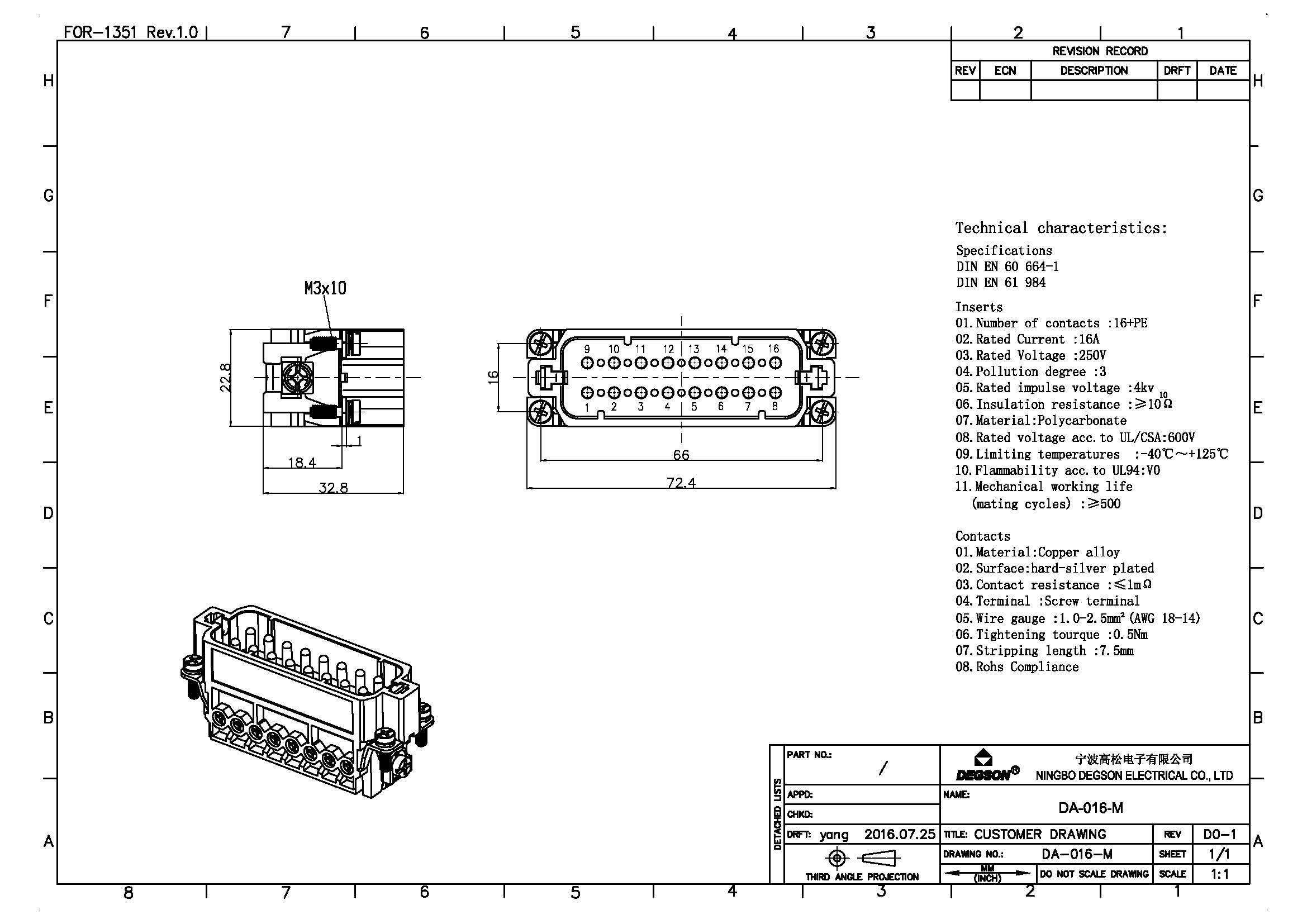 DA-016-M, Вставка в разъем, 16П+PE, 250В, 16А,...