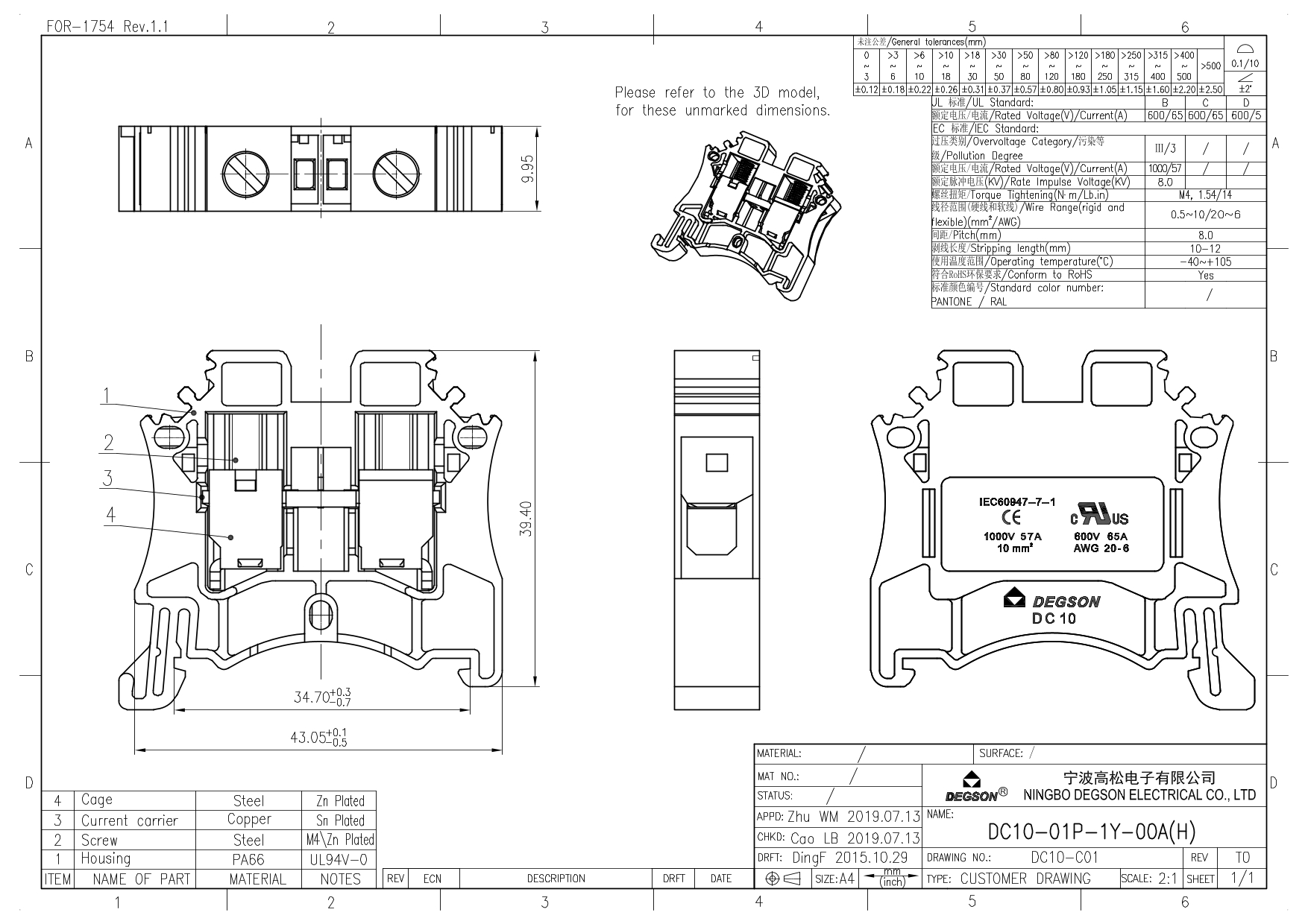 Клемма на дин-рейку, 10 кв.мм, 1 ур, 2 конт, винтовая, серая
