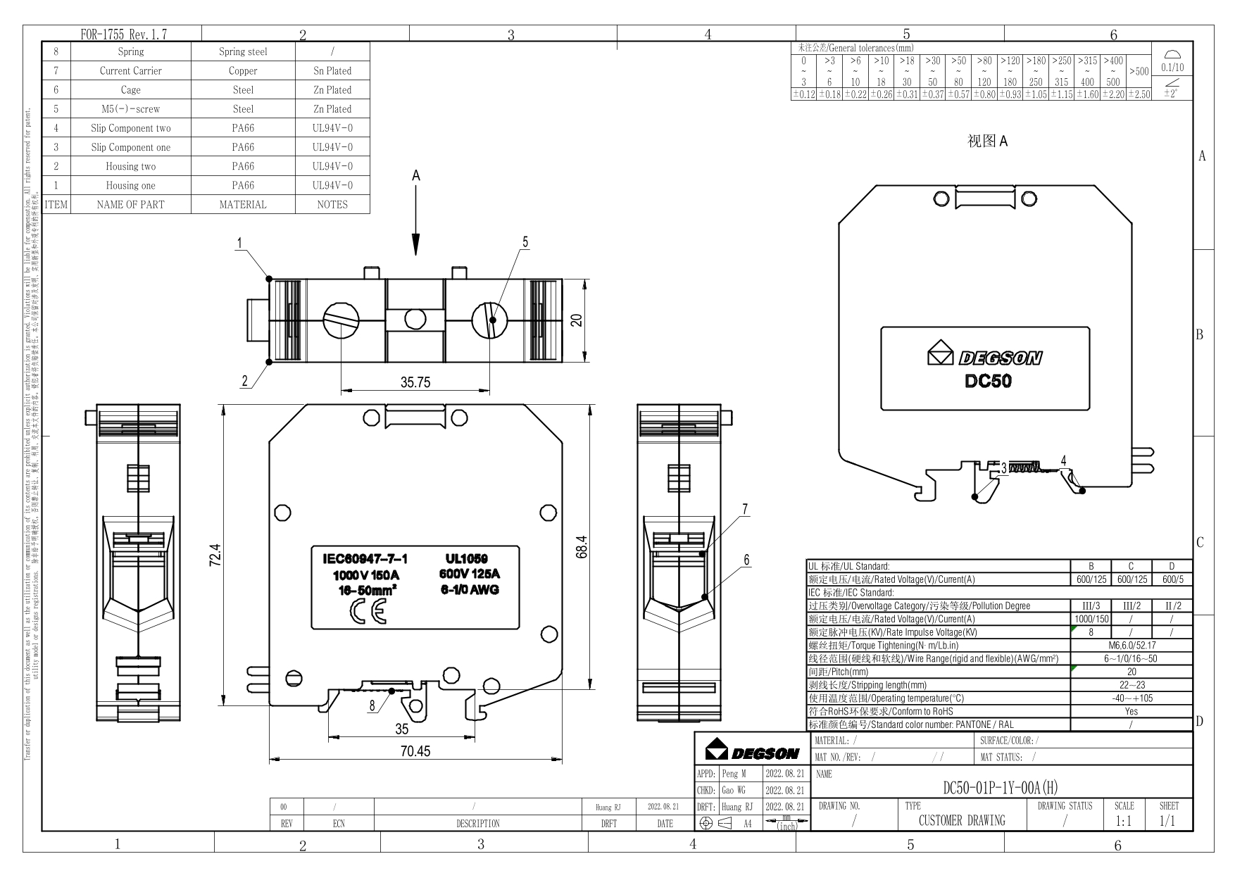 Клемма на дин-рейку, 50 кв.мм, 1 ур, 2 конт, винтовая, серая