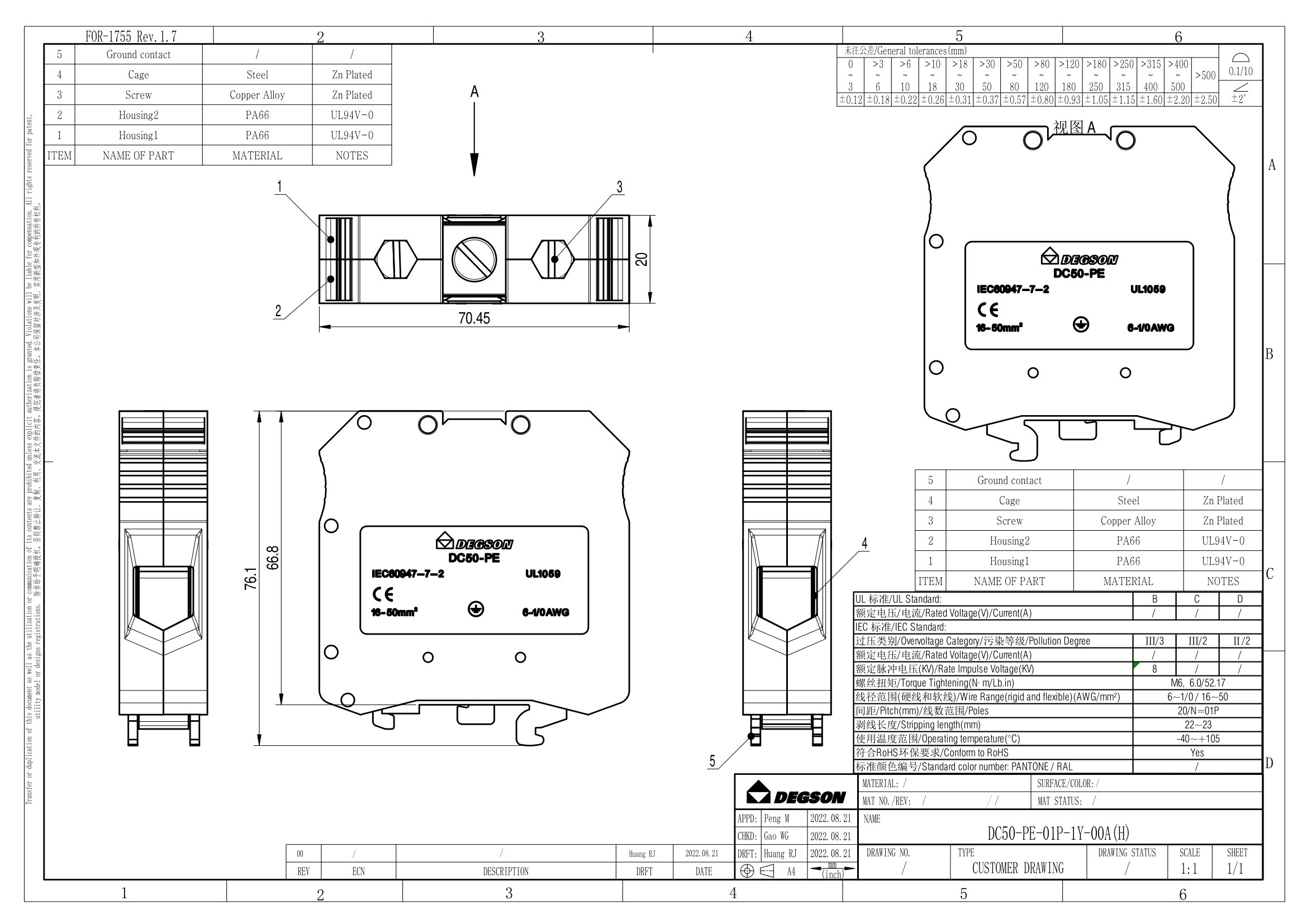 Клемма на дин-рейку, 50 кв.мм, 1 ур, 2 конт, винтовая, земля
