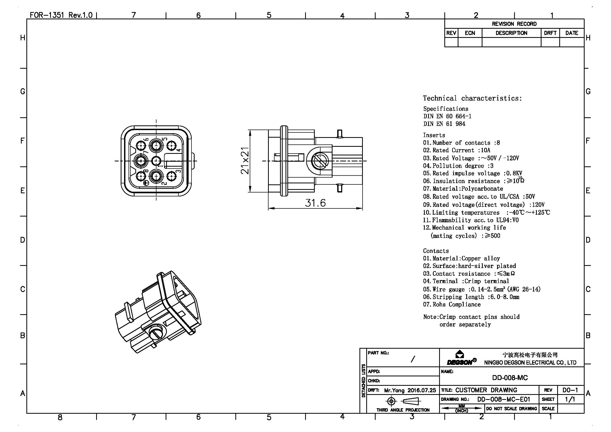 DD-008-MC, Вставка в разъем, 8П+PE, 120В, 10А,...