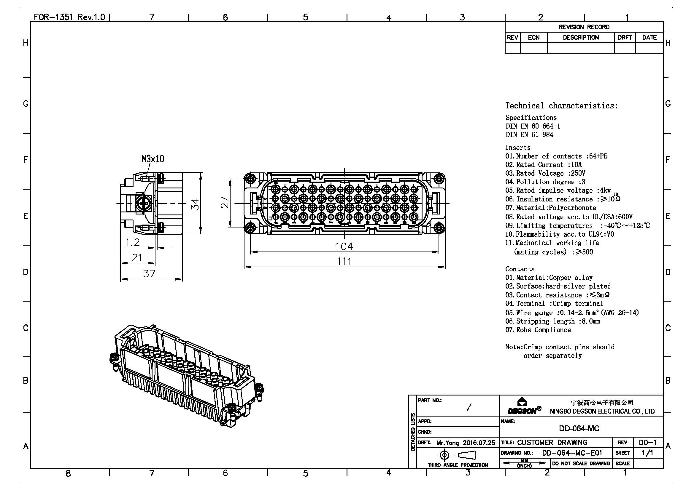 DD-064-MC, Вставка в разъем, 64П+PE, 250В, 10А,...