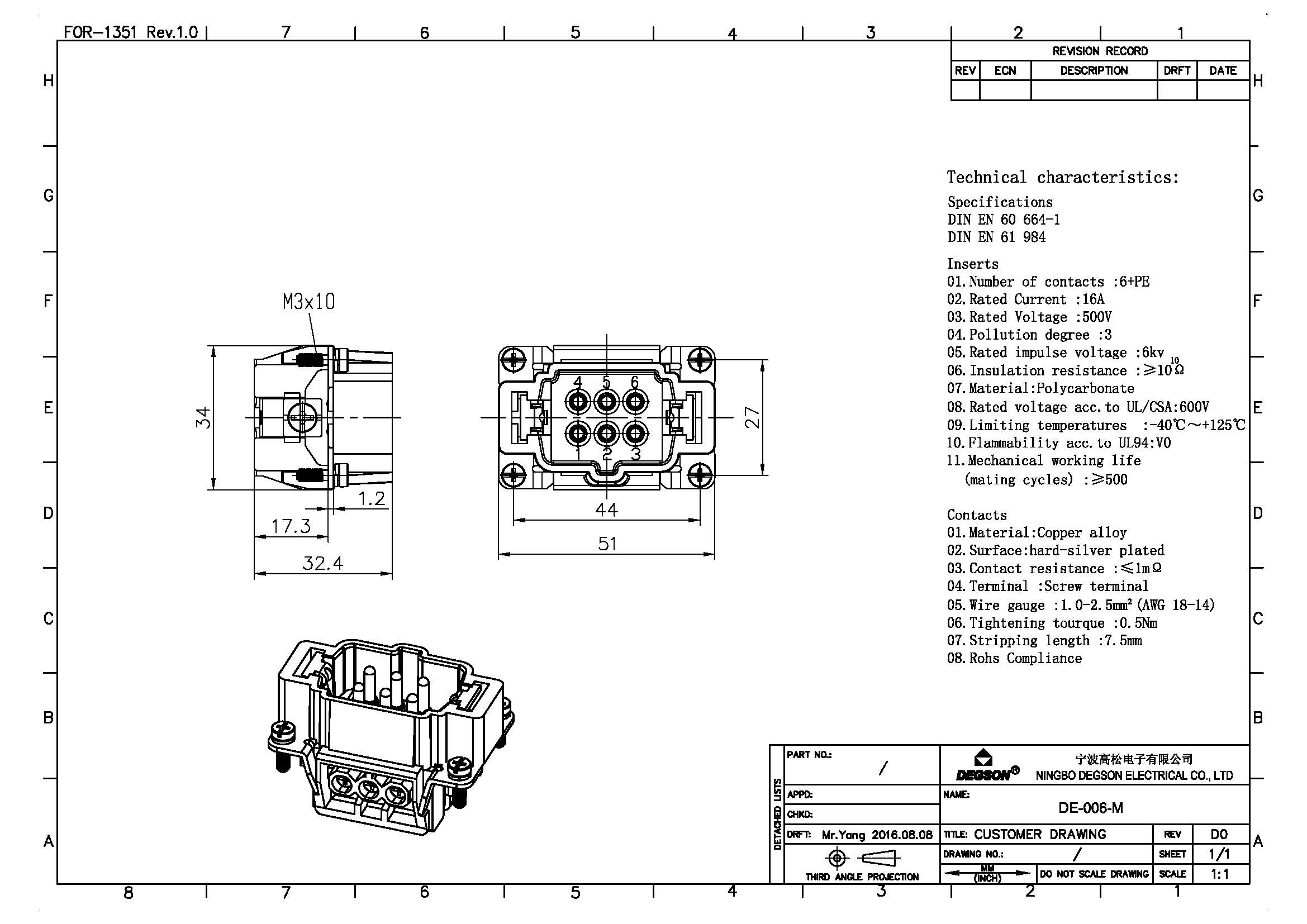 DE-006-M, Вставка в разъем, 6П+PE, 500В, 16А,...