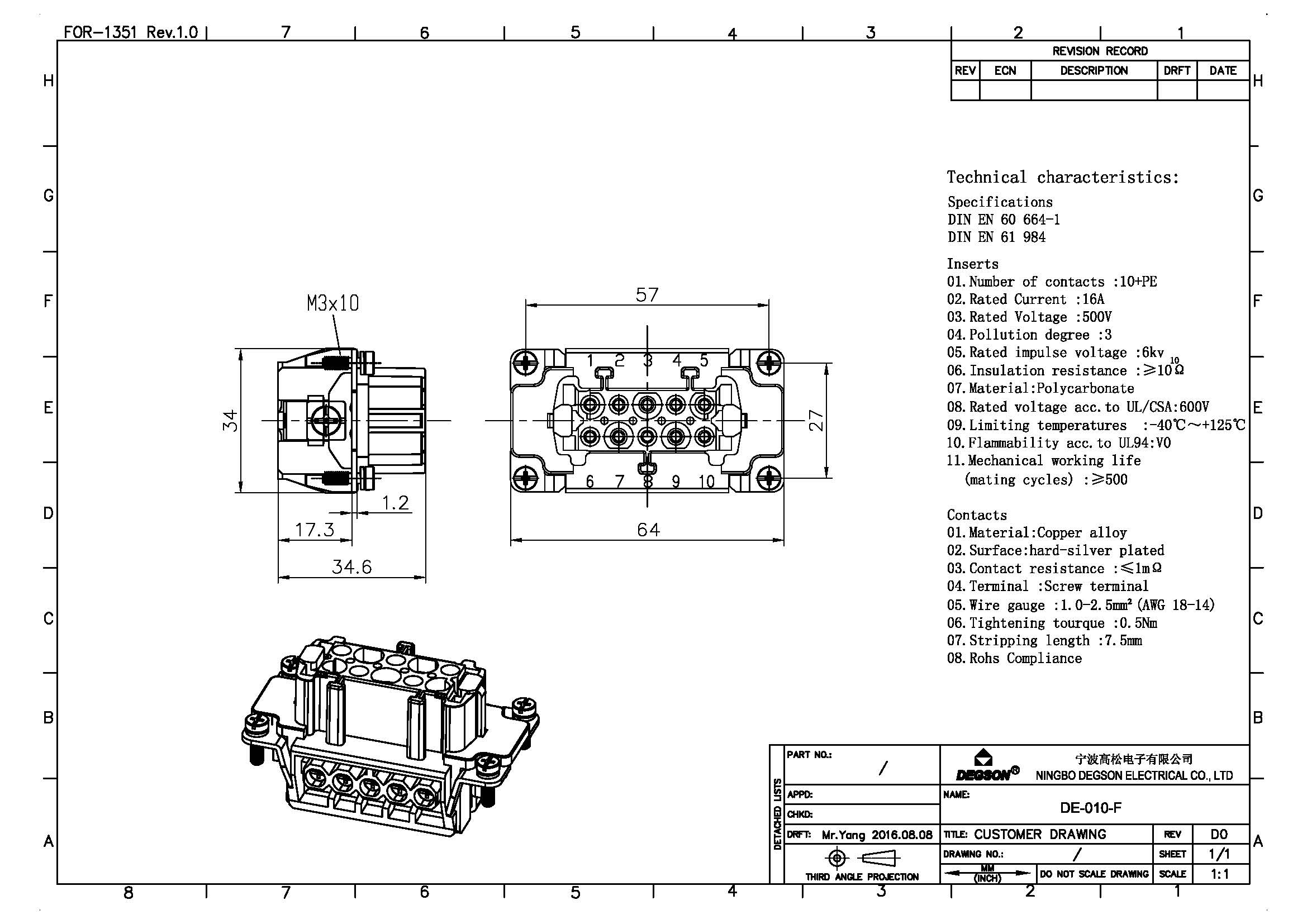 DE-010-F, Вставка в разъем, 10П+PE, 500В, 16А, вилка,...