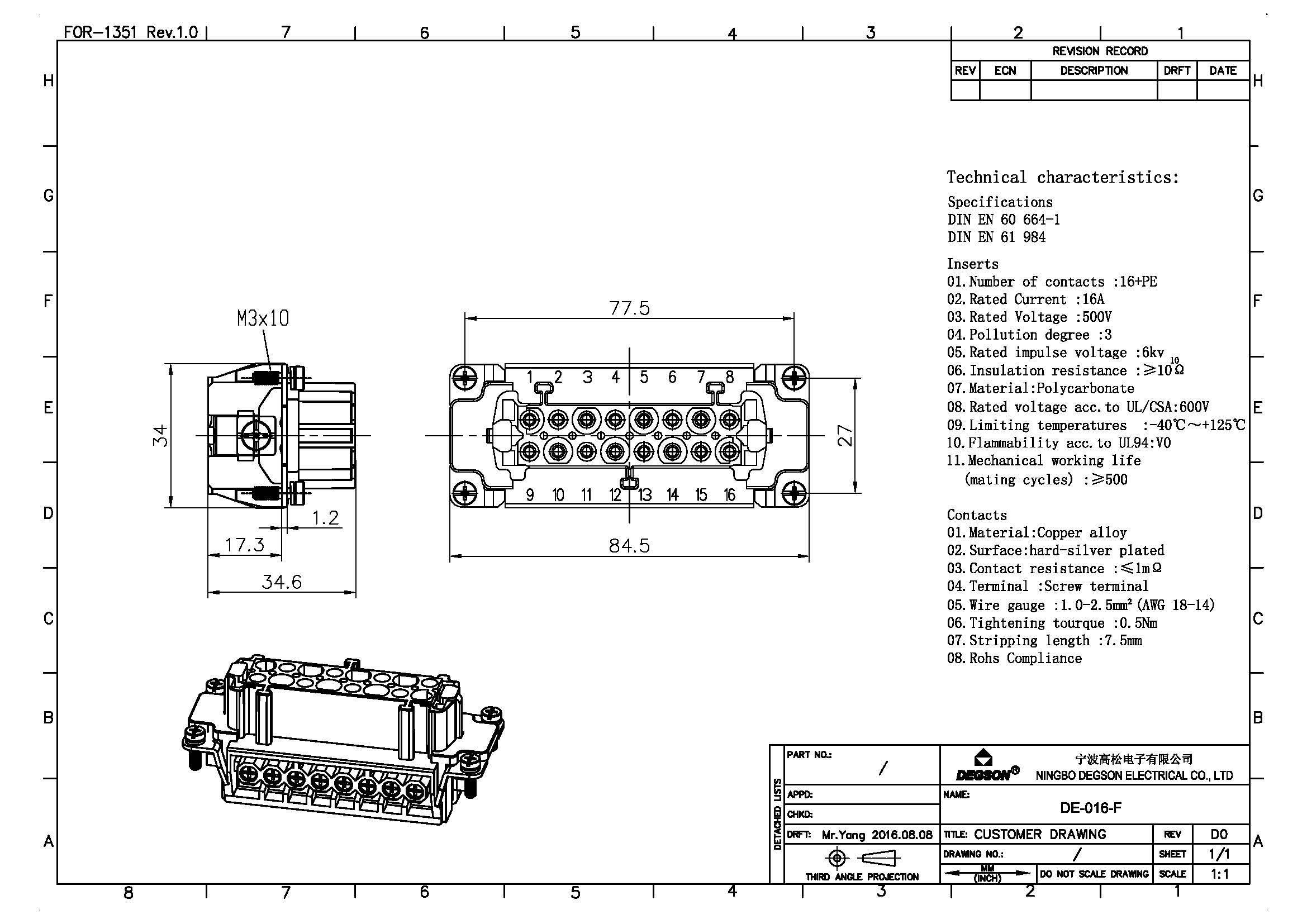 DE-016-F, Вставка в разъем, 16П+PE, 500В, 16А, вилка,...