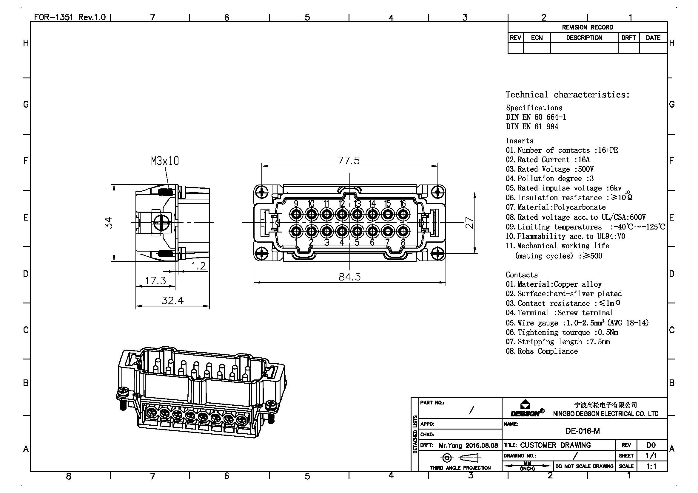 DE-016-M, Вставка в разъем, 16П+PE, 500В, 16А,...