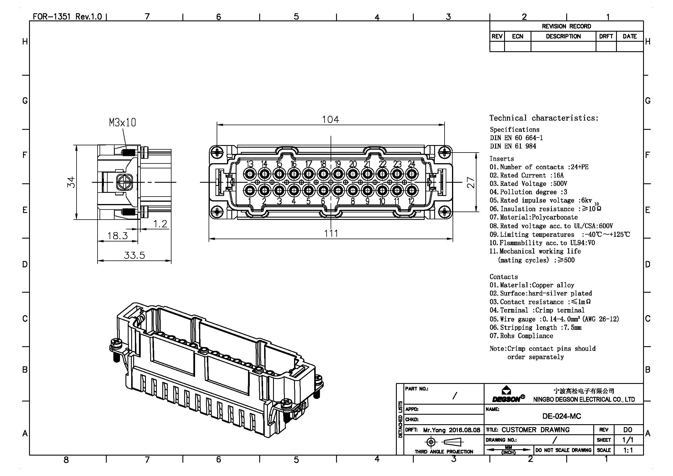 DE-024-MC, Вставка в разъем, 24П+PE, 500В, 16А,...
