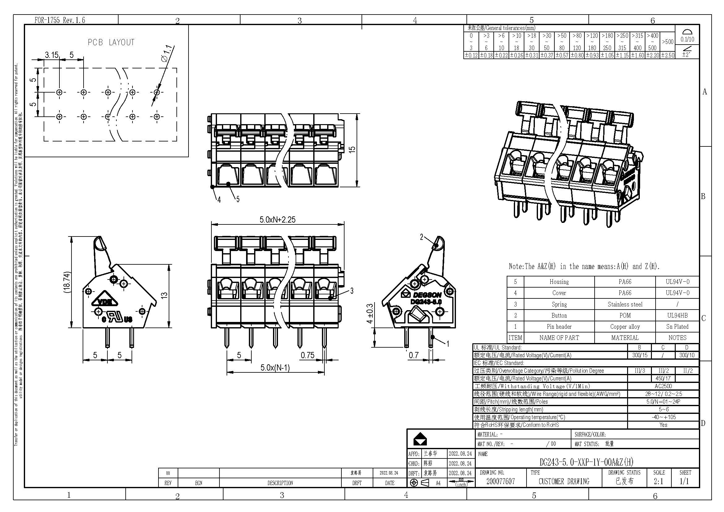 DG243-5.0-04P-11-00Z(H), Клемма на печатную плату, 4...
