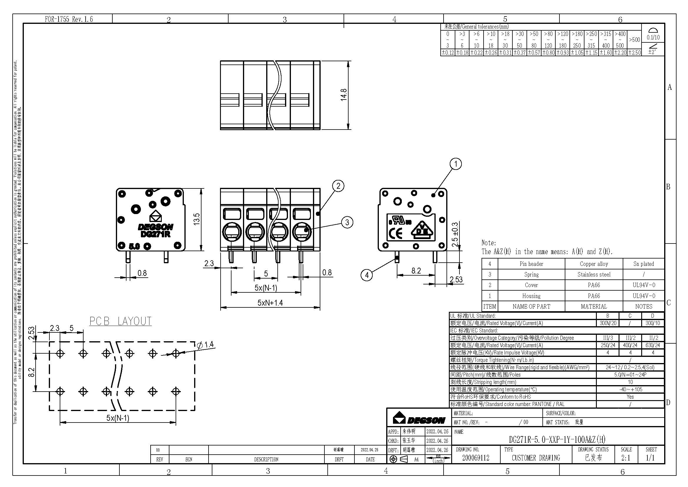 DG271R-7.5-10P-14-100Z(H), Клемма на печатную плату,...