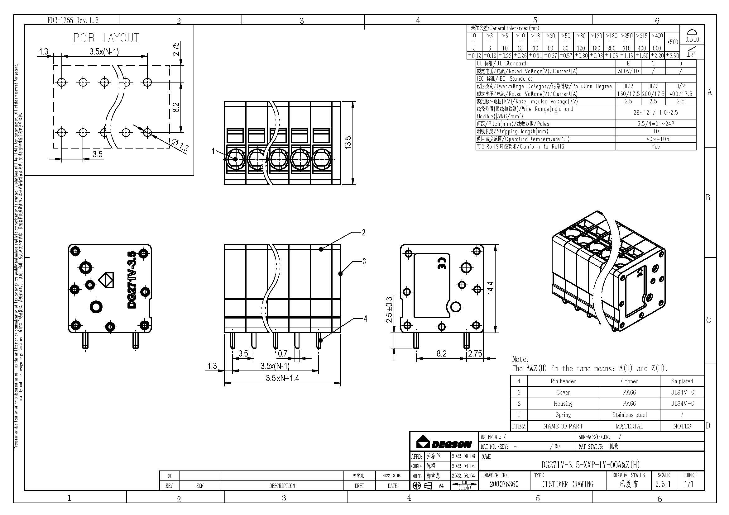 DG271V-3.5-03P-14-00Z(H), Клемма на печатную плату, 3...