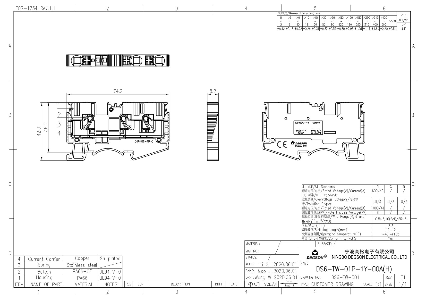 Клемма на дин-рейку, 6 кв.мм, 1 ур., 3 конт, Push-In, синяя
