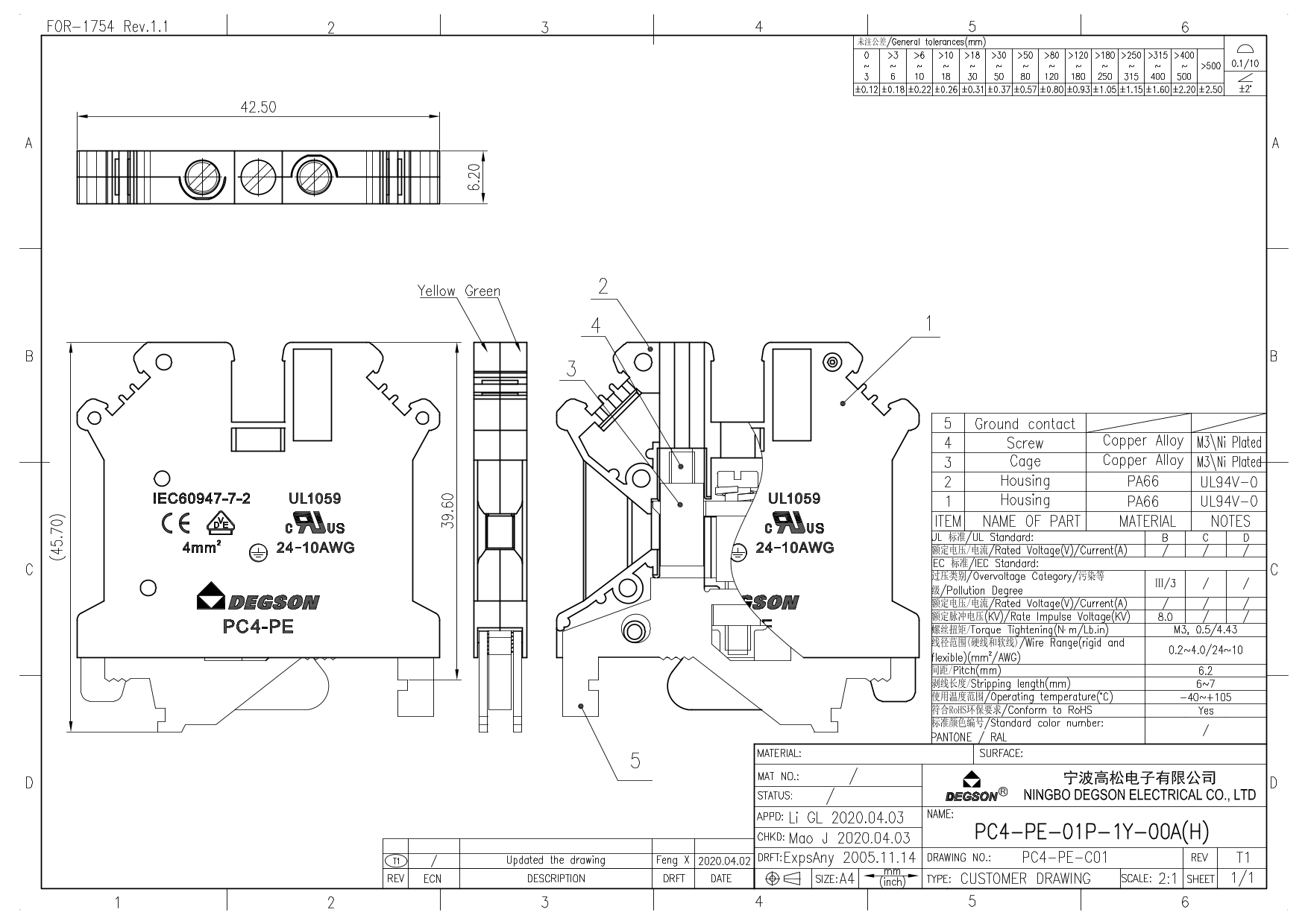 Клемма на дин-рейку, 4 кв.мм, 1 ур, 2 конт, винтовая, земля