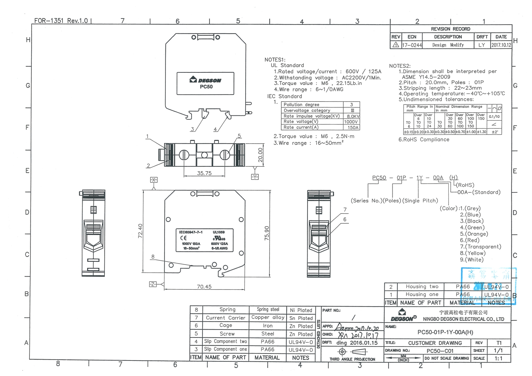 PC50-01P-18-00Z(H), Клемма на дин-рейку, 50 кв.мм, 1...