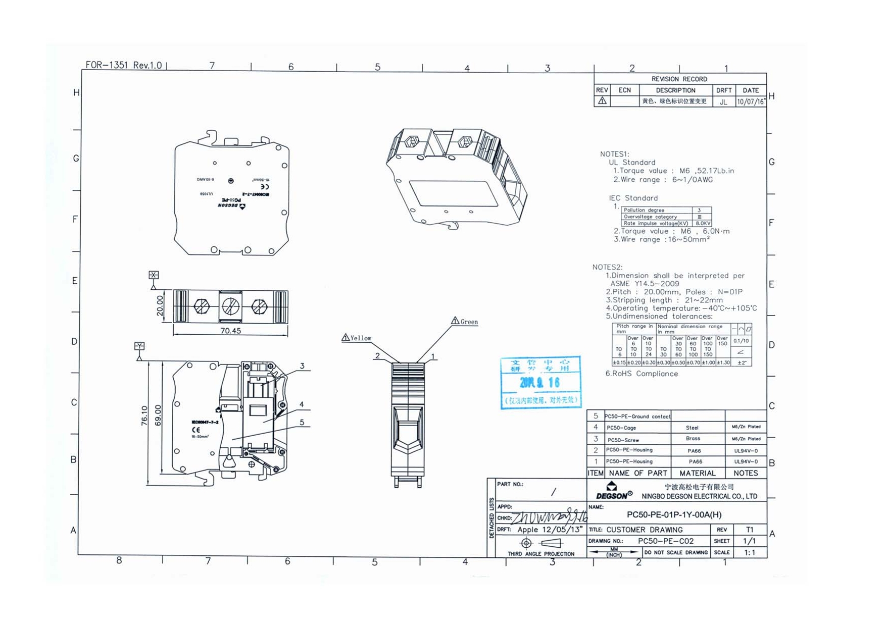 PC50-PE-01P-1Y-00Z(H), Клемма на дин-рейку, 50 кв.мм,...