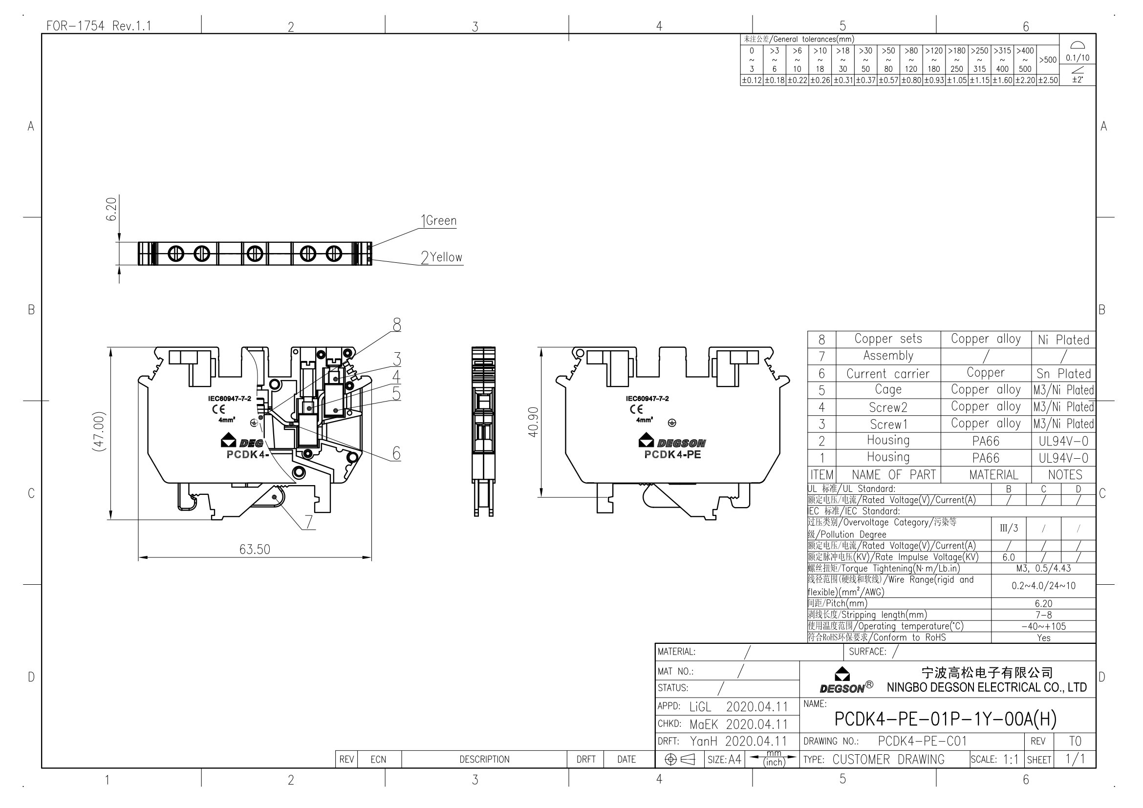 PCDK4-PE-01P-1Y-00Z(H), Клемма на дин-рейку, 4 кв.мм,...