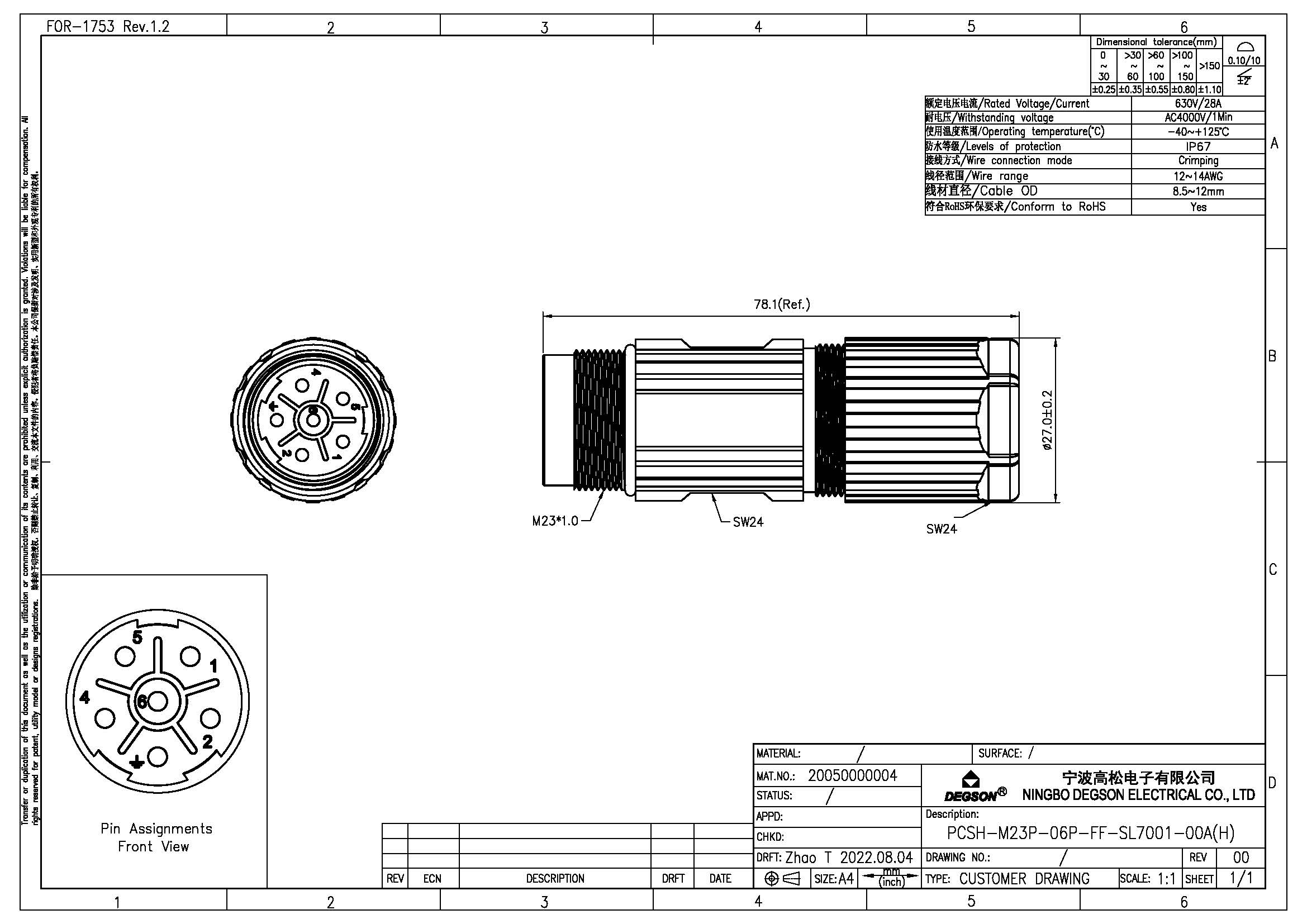 PCSH-M23P-06P-FF-SL7001-00Z(H), Разъем на провод,...