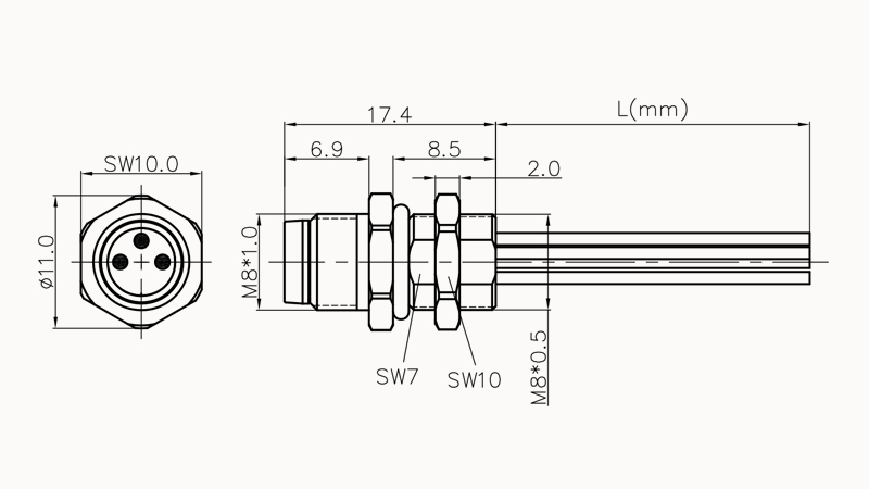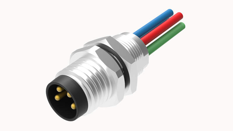 Гнездо для монтажа на панель, M8, 3 пин, переднее крепление, с проводами 0,5 м
